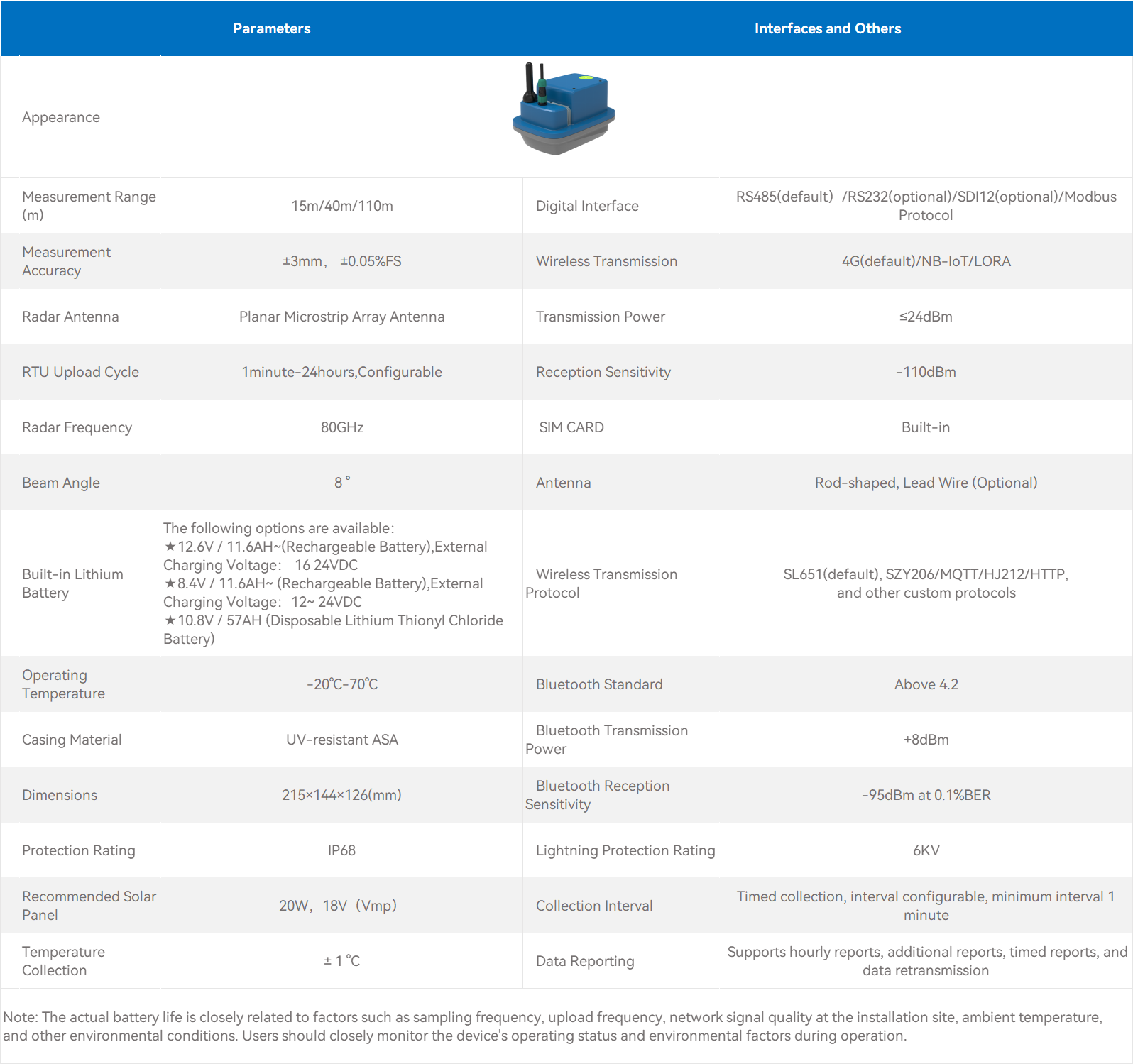 Disposable lithium-thionyl chloride battery lifespan depends on reporting frequency and signal strength.